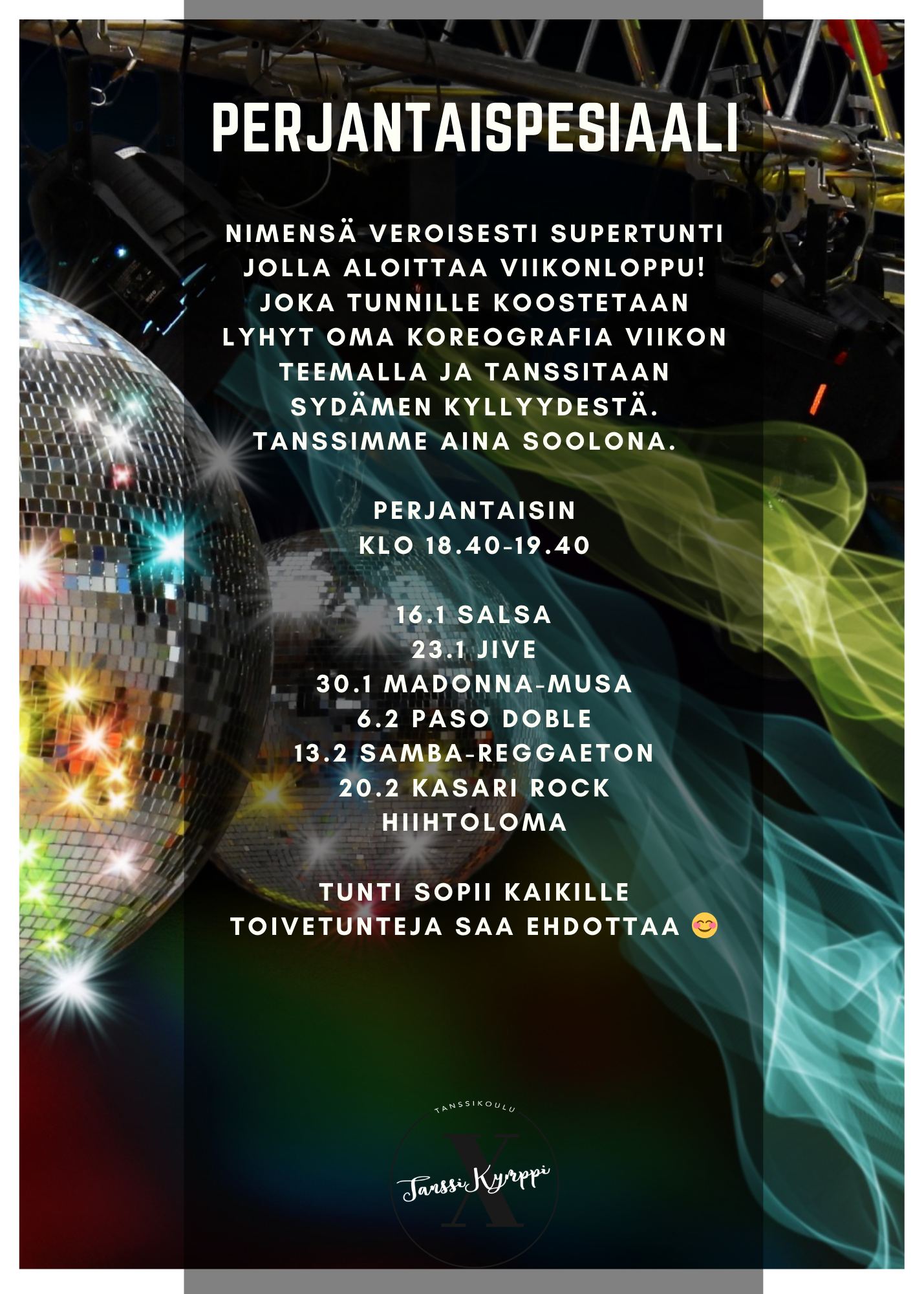 Täällä tiedotamme viikoittain meidän ja tanssikoulun kuulumisia, niin laita sivu kirjainmerkkeihin niin pysyt ajanhermolla!